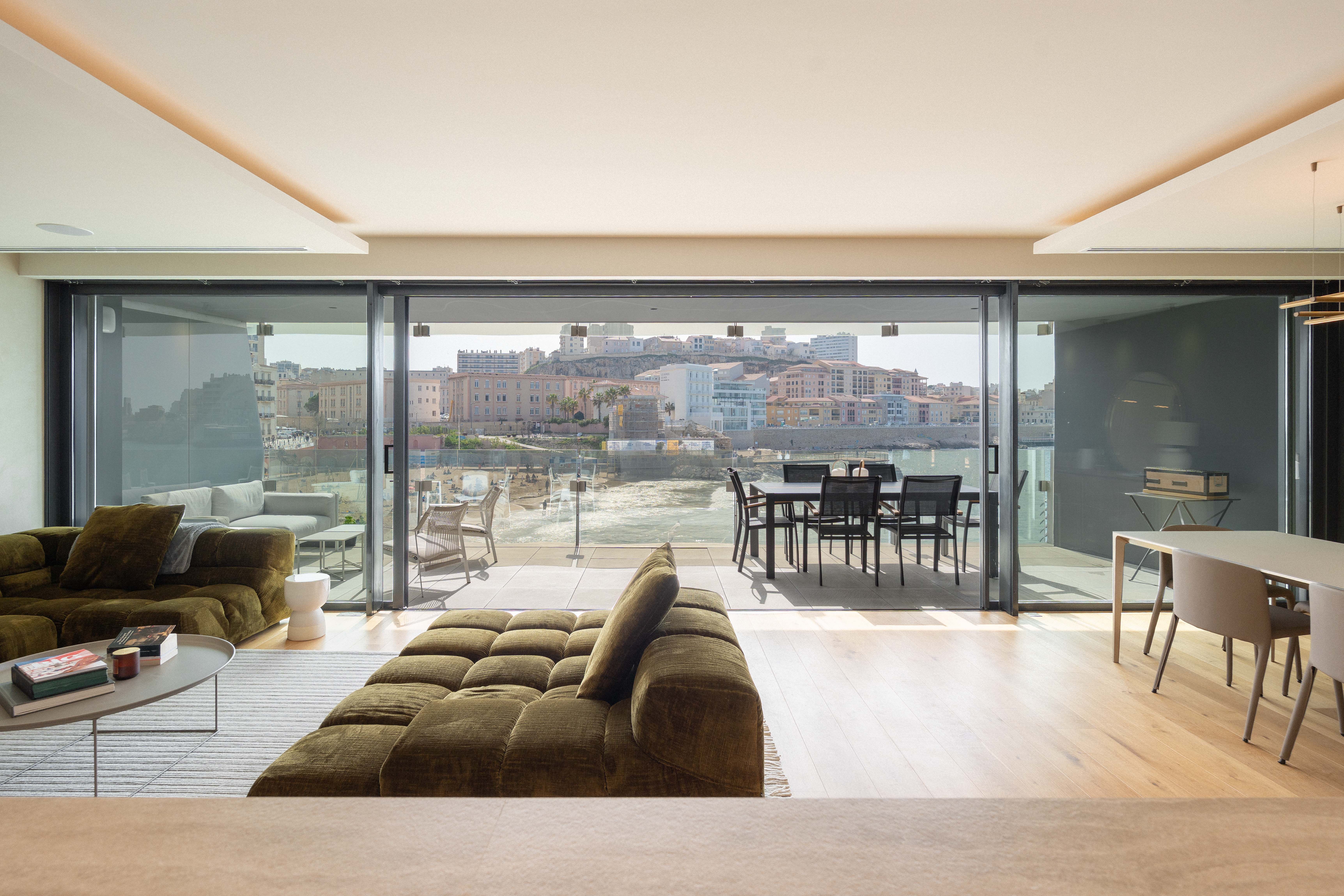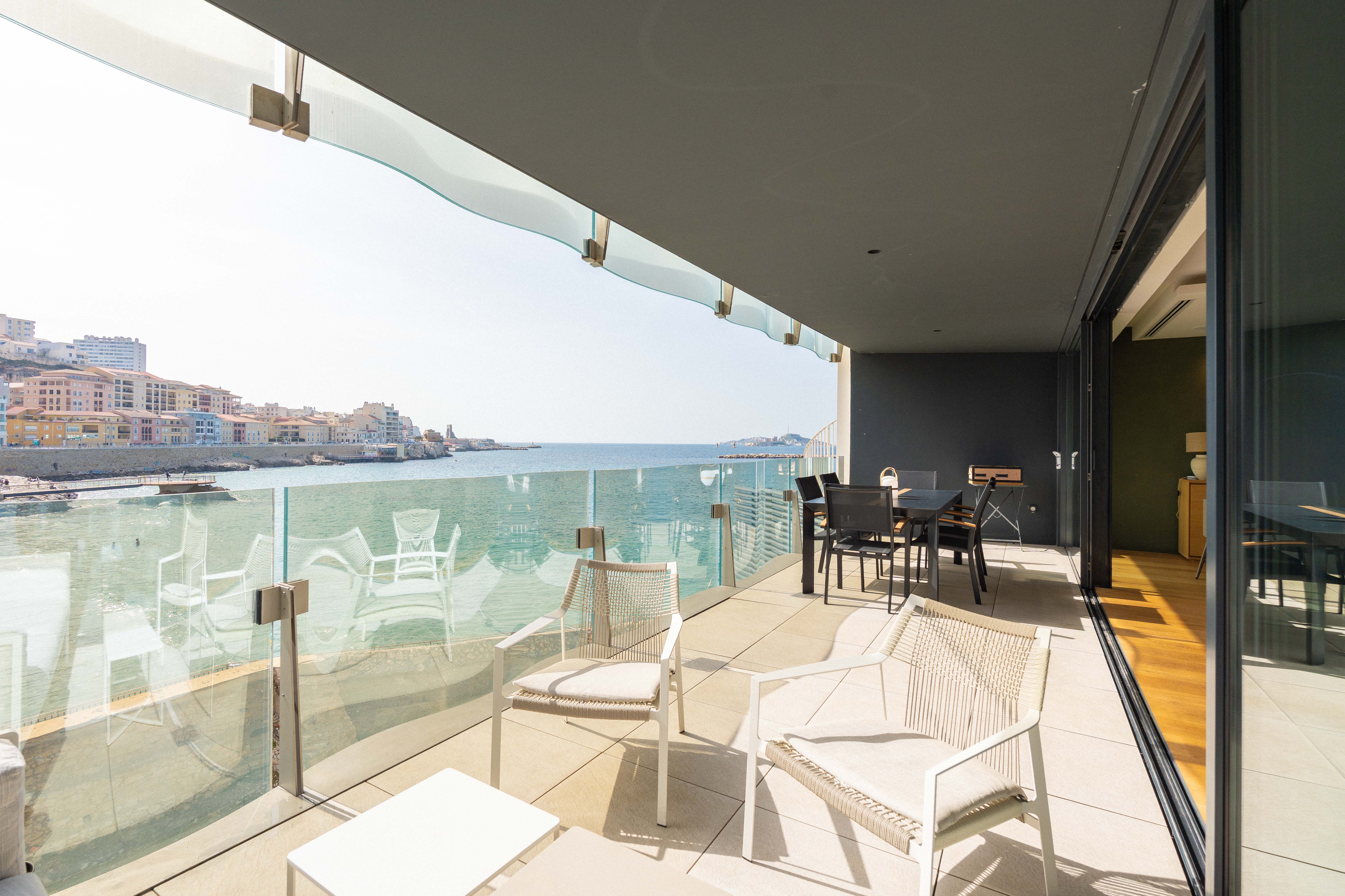 Superbe appartement meublé et décoré avec goût par un cabinet d'architecte d'intérieur renommé, surplombant la mer, situé dans le quartier des Catalans dans le 7e arrondissement.